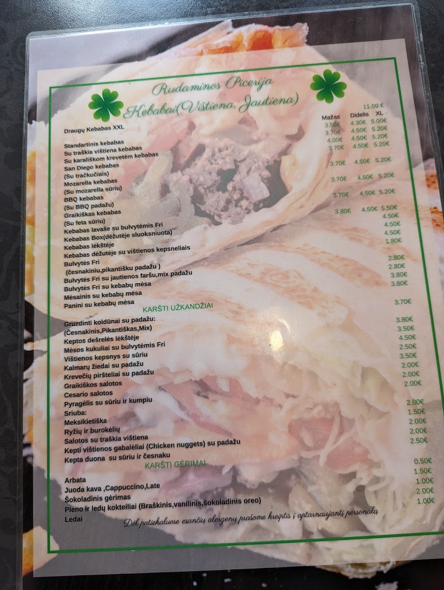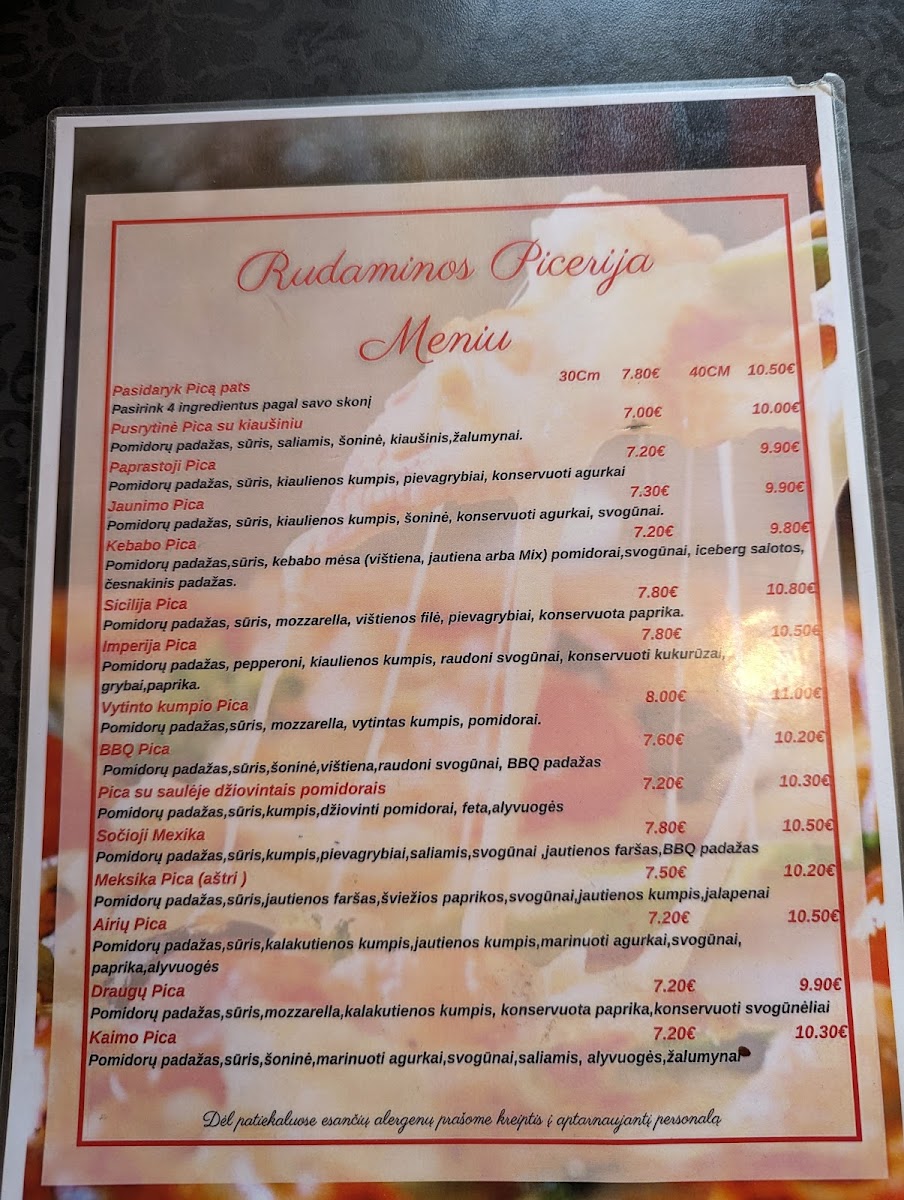 Overall, Rudaminos Picerija combines traditional Italian flavors with local Lithuanian influences, creating a menu that is both familiar and exciting. The dishes are well-executed, with attention to detail in both presentation and taste, ensuring a satisfying dining experience for all visitors.